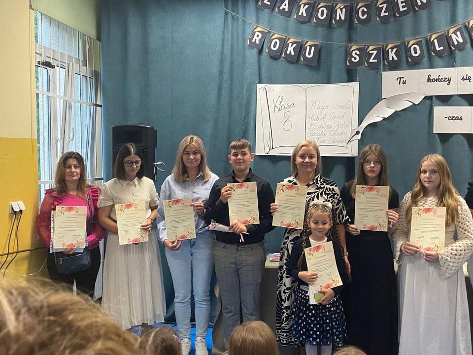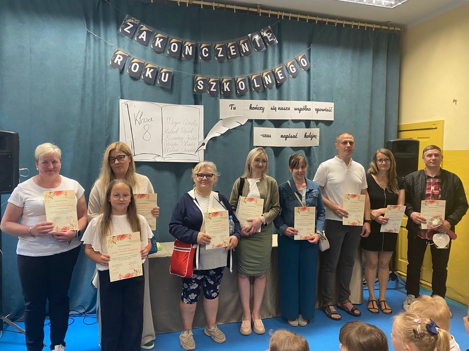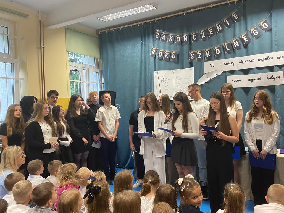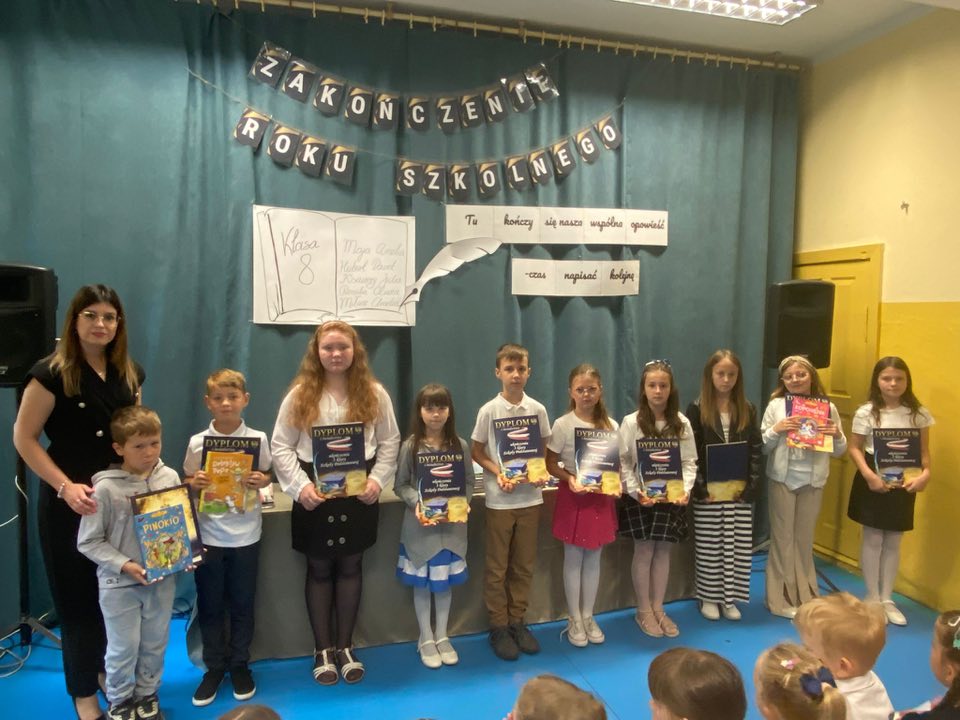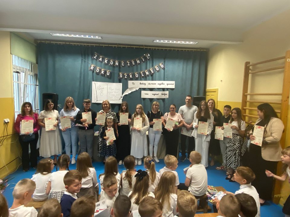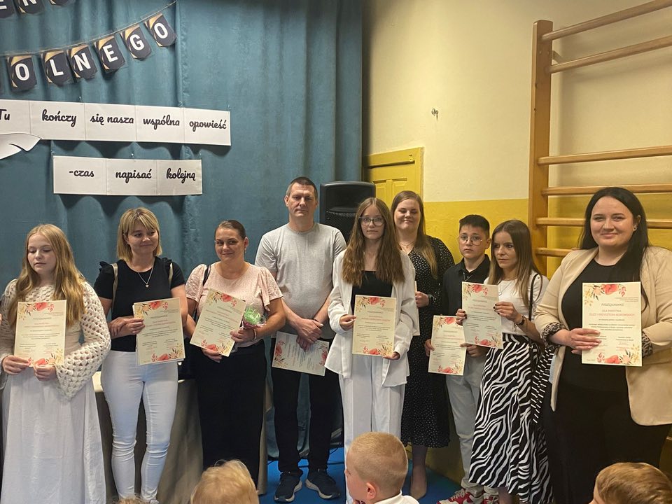 27 czerwca w naszej szkole odbyło się uroczyste zakończenie roku szkolnego. Było to wyjątkowe wydarzenie pełne emocji, wzruszeń, uśmiechów oraz wspólnych wspomnień. Ósmoklasiści podziękowali nauczycielom i rodzicom za trud włożony w ich wychowanie i przekazaną wiedzę, a uczniowie klasy VII pożegnali swoich starszych kolegów życząc im powodzenia na dalszej ścieżce edukacji. Pani dyrektor również pożegnała naszych absolwentów i podziękowała wszystkim za miniony rok szkolny. Dzisiejszy apel był także okazją do wręczenia nagród za celujące i bardzo dobre wyniki w nauce, 100 % frekwencję, wzorowe czytelnictwo i wybitne osiągnięcia szachowe. Uczniowie z najwyższą średnią: Alan Szmit, Jakub Galiński i Monika Stumska otrzymali nagrody ufundowane przez proboszcza parafii Boleszyn – księdza Piotra Nowaka. Ponadto rodzice naszych zdolnych absolwentów otrzymali listy gratulacyjne. Wręczając podziękowania doceniono również pracę rodziców, którzy angażują się w życie szkoły i niosą pomoc.