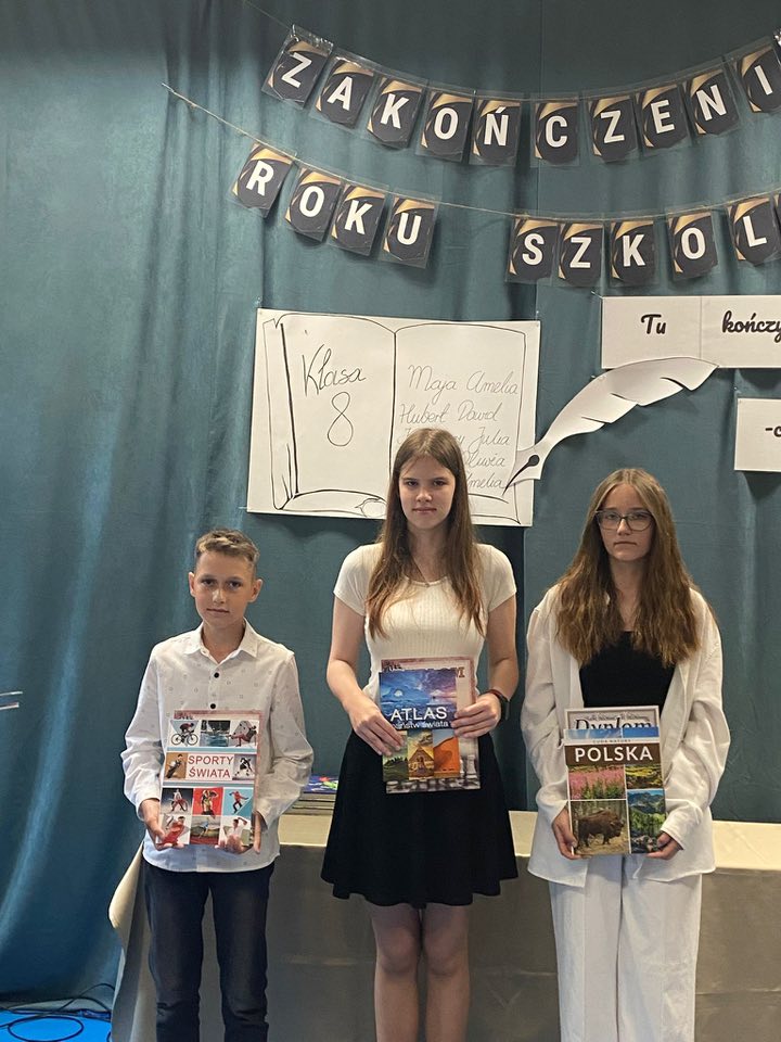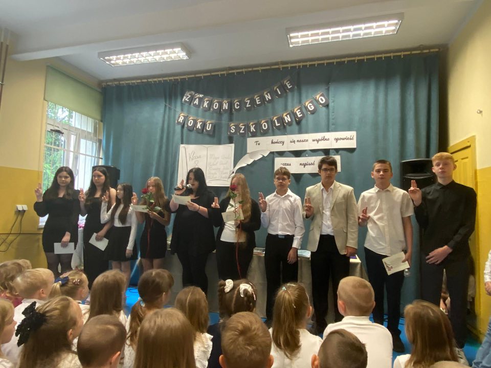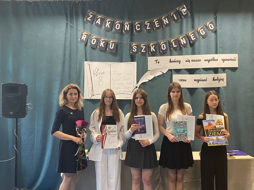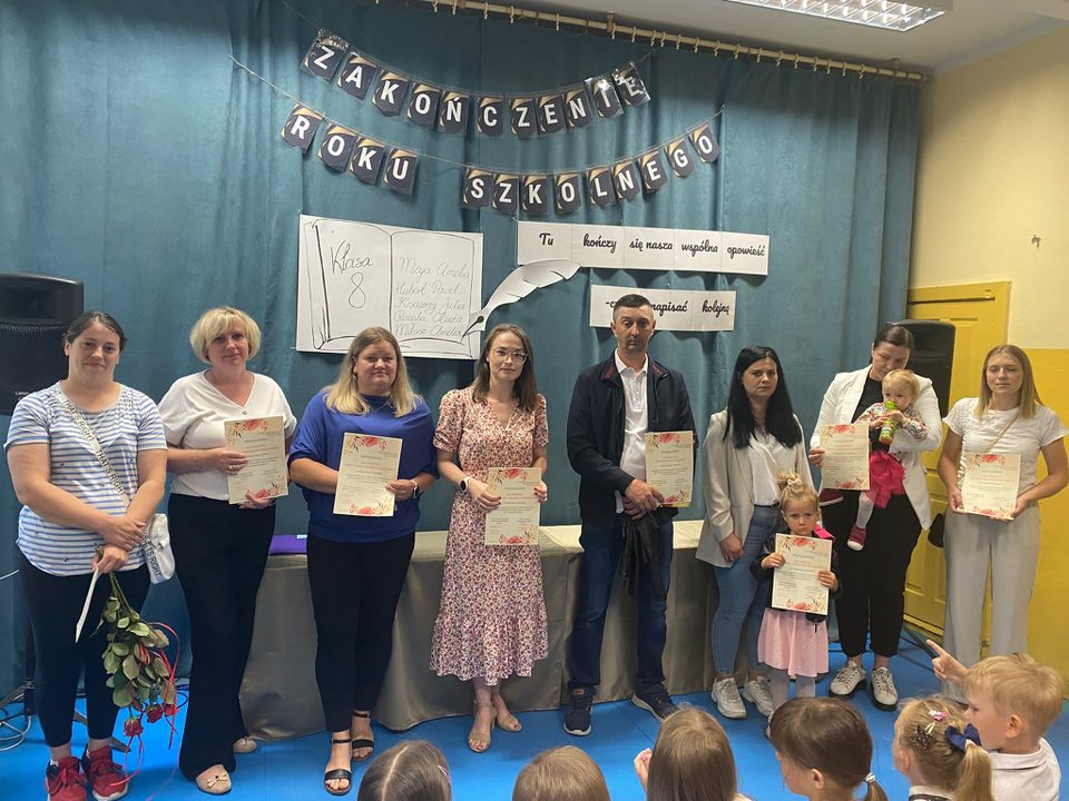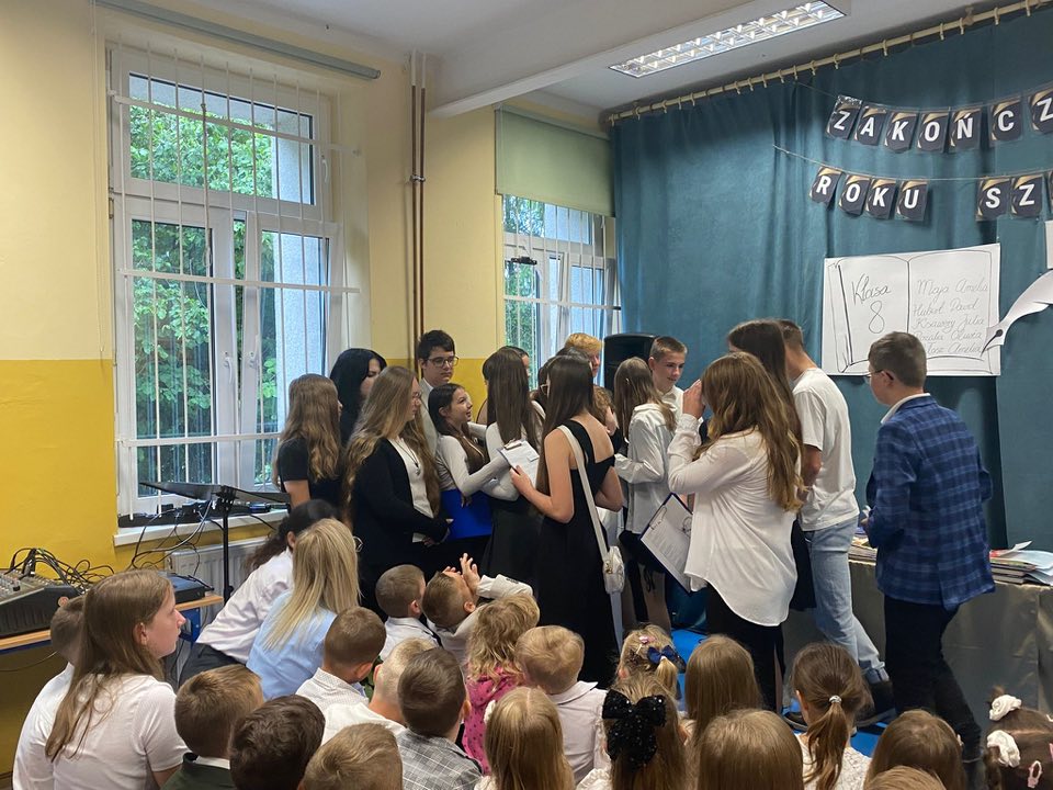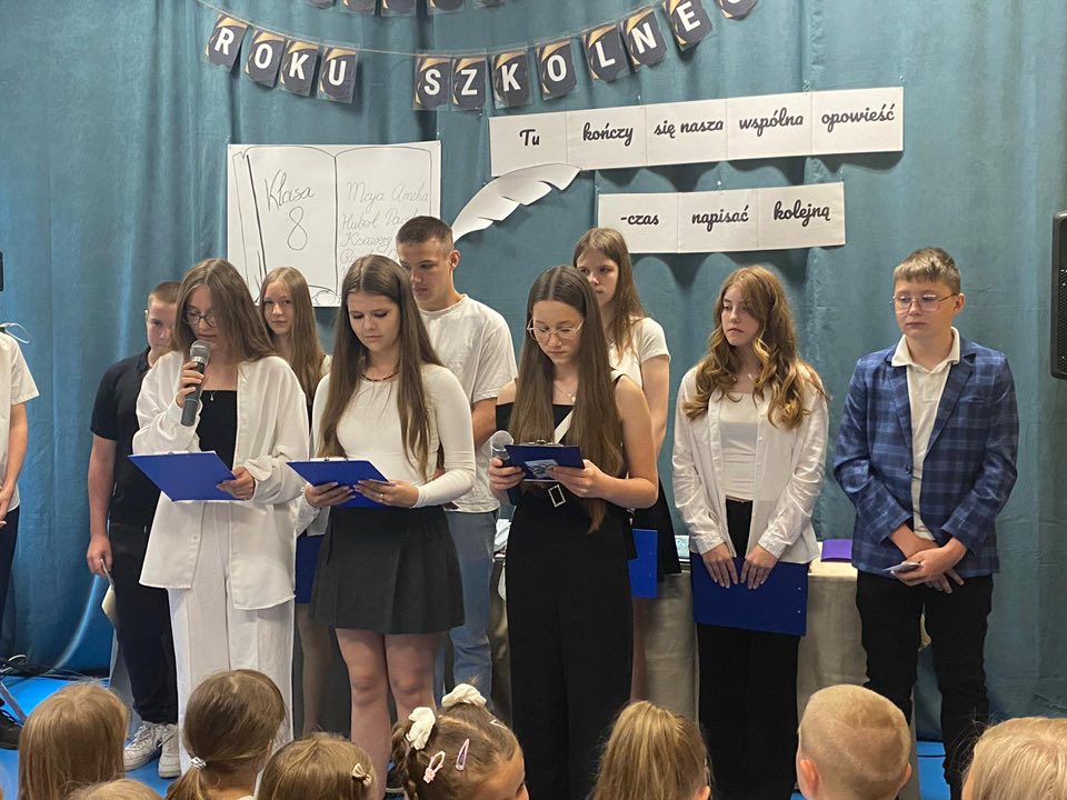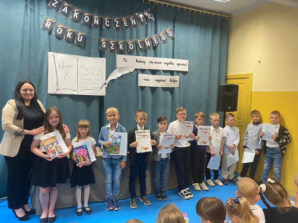 27 czerwca w naszej szkole odbyło się uroczyste zakończenie roku szkolnego. Było to wyjątkowe wydarzenie pełne emocji, wzruszeń, uśmiechów oraz wspólnych wspomnień. Ósmoklasiści podziękowali nauczycielom i rodzicom za trud włożony w ich wychowanie i przekazaną wiedzę, a uczniowie klasy VII pożegnali swoich starszych kolegów życząc im powodzenia na dalszej ścieżce edukacji. Pani dyrektor również pożegnała naszych absolwentów i podziękowała wszystkim za miniony rok szkolny. Dzisiejszy apel był także okazją do wręczenia nagród za celujące i bardzo dobre wyniki w nauce, 100 % frekwencję, wzorowe czytelnictwo i wybitne osiągnięcia szachowe. Uczniowie z najwyższą średnią: Alan Szmit, Jakub Galiński i Monika Stumska otrzymali nagrody ufundowane przez proboszcza parafii Boleszyn – księdza Piotra Nowaka. Ponadto rodzice naszych zdolnych absolwentów otrzymali listy gratulacyjne. Wręczając podziękowania doceniono również pracę rodziców, którzy angażują się w życie szkoły i niosą pomoc.