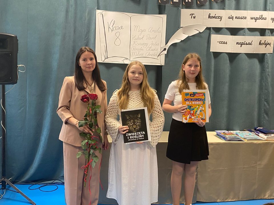 Dziękujemy gościom i rodzicom za przybycie na dzisiejszą uroczystość, Pani Alinie Stachewicz za upominki dla naszych ósmoklasistów, burmistrzowi miasta Lidzbark-Panu Andrzejowi Piątkowskiemu za życzenia, a szkole i Radzie Rodziców za ufundowanie dyplomów i nagród książkowych.
